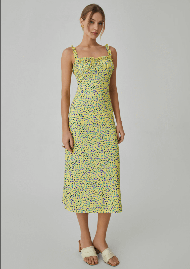 This sleeveless midi dress blends everyday comfort with a touch of whimsical charm. Designed in a flattering slim-fit silhouette, it drapes beautifully along your curves, while the soft, medium-stretch jersey moves with you for all-day ease. Delicate lettuce trim and a captivating print add the perfect dash of personality—making it your go-to for leisurely afternoons, sunlit strolls, and dreamy vacation escapes.